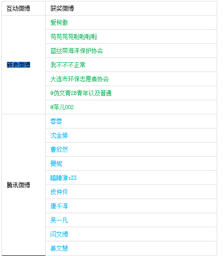 牙牙、相思雨纷飞、熏衣草、浅吟夏诗、古惑夜侬、茶霏花开、雷飘塔尖、蓝色礼物、xiaoyu、zino等十名微友在规定期限内转发蓝色宣言或发表与海洋环保相关的蓝色宣言。