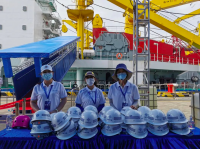 在参观“天鲲号”前,志愿者还亲切地为小朋友们带好安全帽