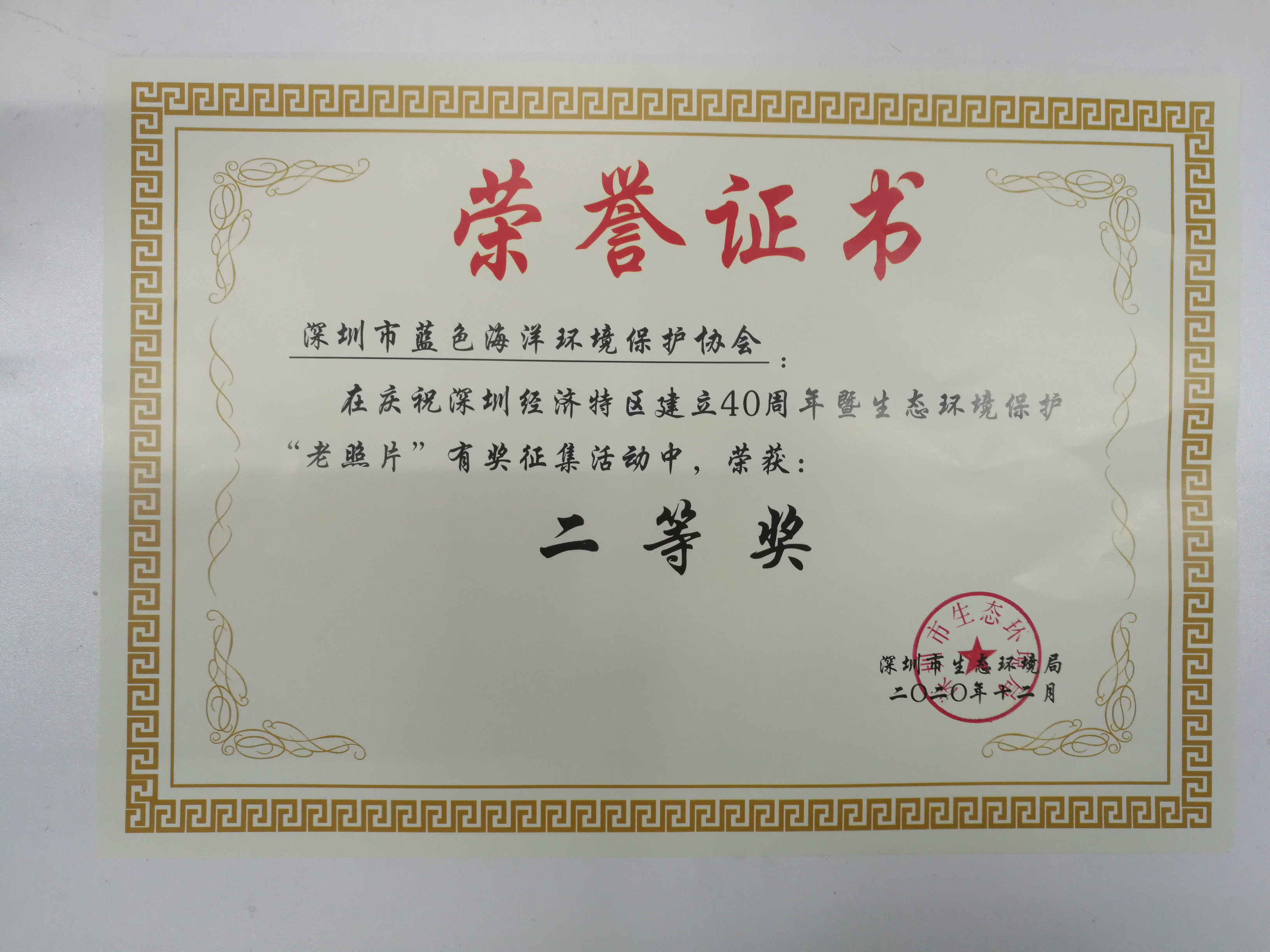 2020年12月,深圳市蓝色海洋环境保护协会获深圳经济特区建立40周年暨生态环境保护“老照片”有奖征集二等奖。