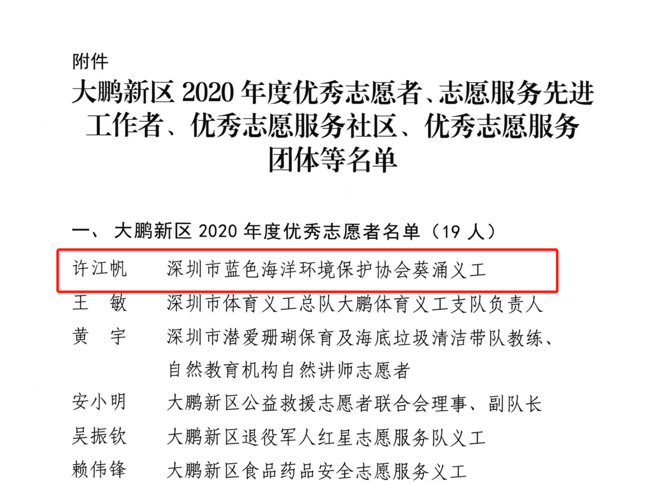 【喜讯】蓝色海洋志愿者——许江帆,被评为大鹏新区2020年度优秀志愿者