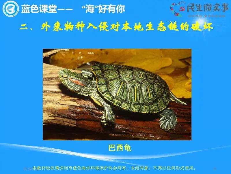 除了植物,一些动物的入侵破坏行为也是很严重的。比方说:巴西龟、福寿螺、清道夫、革胡子鲶、鰕虎鱼、牛蛙、罗非鱼等等。