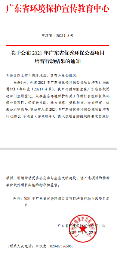 各地级以上市生态环境局,各有关社会组织:根据《关于开展 2021 年广东省优秀环保公益项目培育行动的通知》(粤环宣〔2021〕4 号),我中心面向依法在广东省各级民政部门注册登记、从事生态环境保护相关工作的社会组织征集环保公益项目。经宣传发动、地方推荐、资格初审、专家评审、结 果公示等程序,现公布入选 2021 年广东省优秀环保公益项目培育行动的 20 个项目(详见附件)。请入选项目的组织按要求实施好项目,引领带动更多公众参与生态文明建设。请入选项目的推荐 单位做好项目实施的指导和监督。