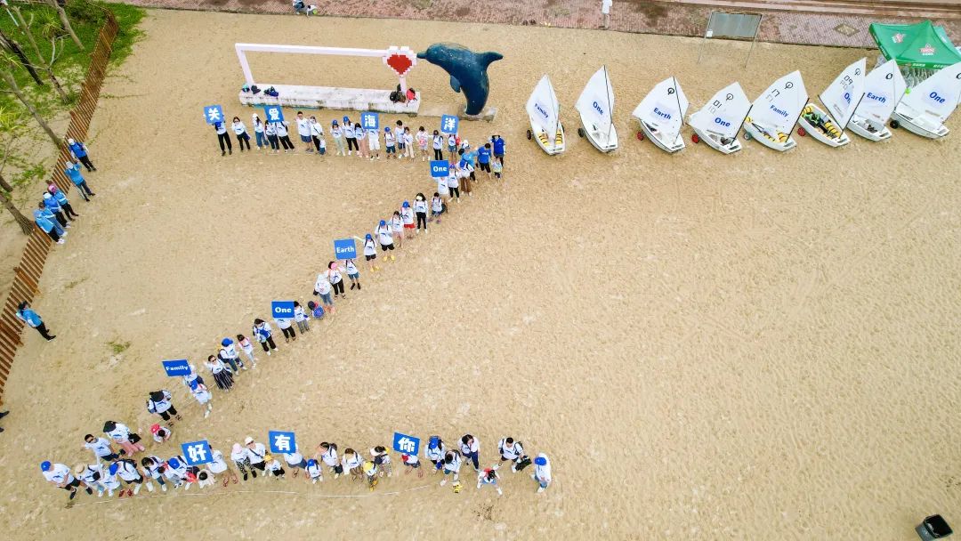 航拍下,百余位志愿者在沙滩上摆成字母“Z”造型,以展示以星ZIM对海洋环保的支持。 大家手持“关爱海洋 海好有你”“One Earth One Family”,挥手示爱海洋。