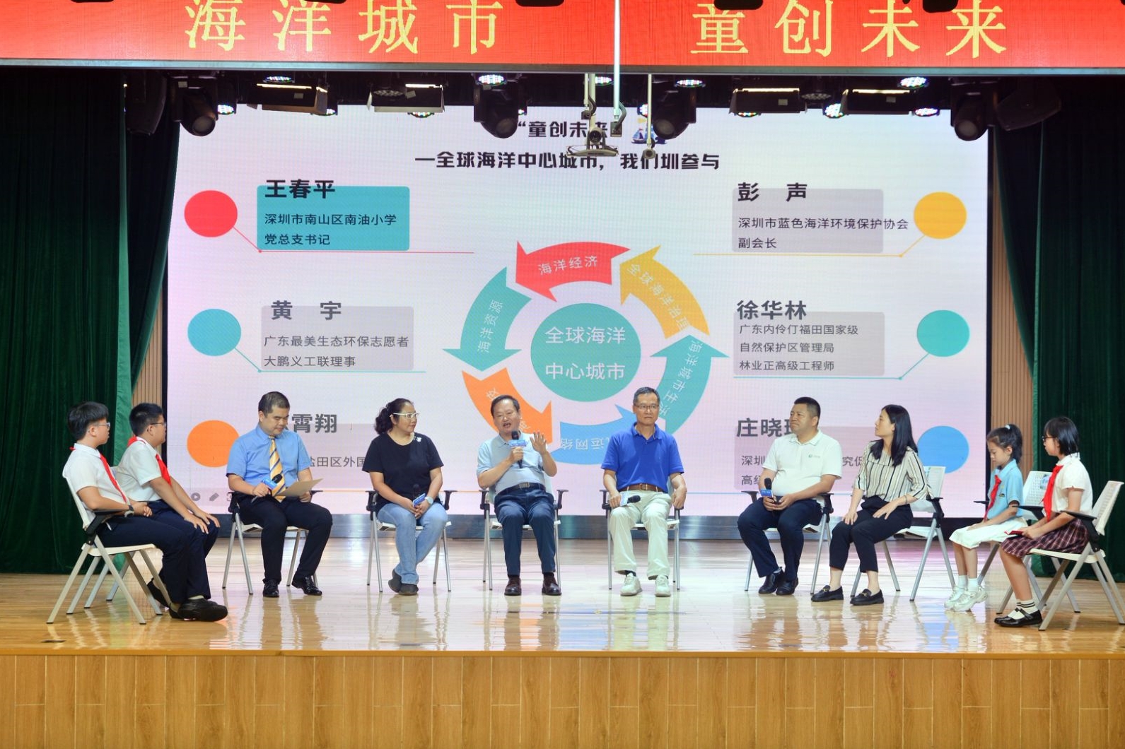 南油小学党总支书记王春平 引用习近平总书记在历届党代会上关于生态环保的重要讲话,分享了南油小学作为首批国际生态学校,近年来围绕海洋环保科普宣教所做的努力。深圳作为国际红树林中心,红树林的保护是海洋环保的核心议题, 广东内伶仃福田国家级自然保护区管理局林业正高级工程师徐华林 带领大家领略了美轮美奂的红树林湿地生物多样性,并呼吁大家共同观察、关注和关心红树林。深圳是志愿者之城,海洋环保离不开众多环保志愿者的无私奉献,广东最美生态环保志愿者、 大鹏义工联理事黄宇 则带领着现场观众一起“潜入”海底,看一看海洋垃圾的肆虐,感受海洋环保的必要性和迫切性。最后, 深圳市海洋发展研究促进中心高级工程师、海洋预报员庄晓珊 女士 分享了海洋预报的专业知识,并带领大家提前感受了未来海洋经济和文旅的发展方向,其中关于“海底高铁”、“海底咖啡厅”的设想让观众们惊叹不已。 主持人陈霄翔 老师 则分享了盐外长期开展“春种树,夏出海,秋劳作,冬观鸟”的“四季课程”经验,号召大家共同参与围绕海洋开展的系列项目式学习活动。现场邀请来自南油小学和盐田区外国语学校的学生代表,以儿童的视角向专家提出自己关心的问题,并讨论儿童应如何参与到深圳建设全球海洋中心城市的工作中。同时,提出并推动深圳建设全球海洋中心城市的 梁俊乾先生 , 深圳第一代海洋公民科学家王炳老师 也莅临现场,激励了在场的每一位学生代表,为年轻一代树立了积极参与海洋保护和探索海洋科学的榜样,共同为深圳的海洋未来贡献智慧和力量。