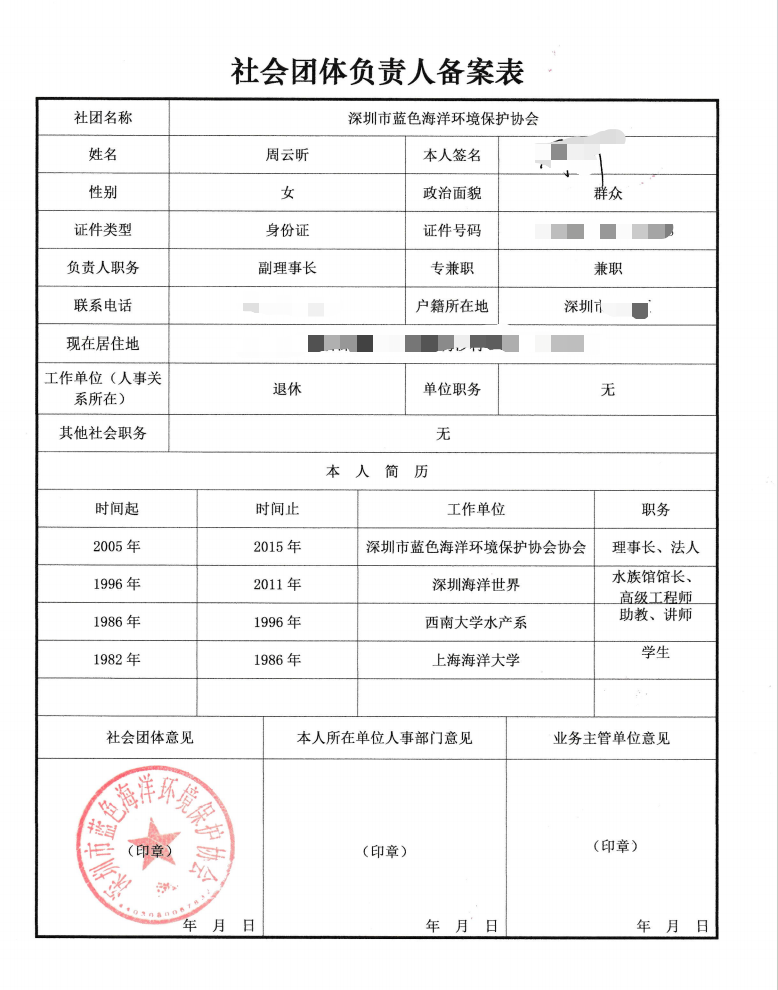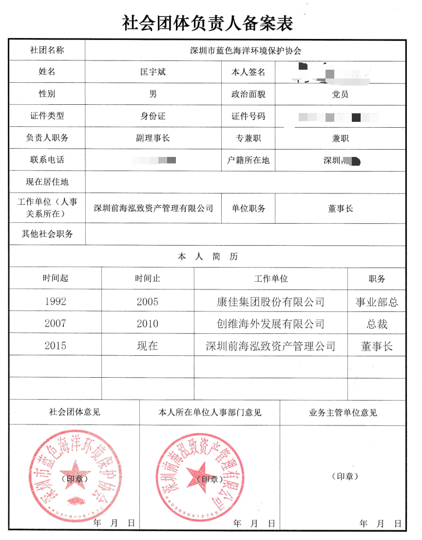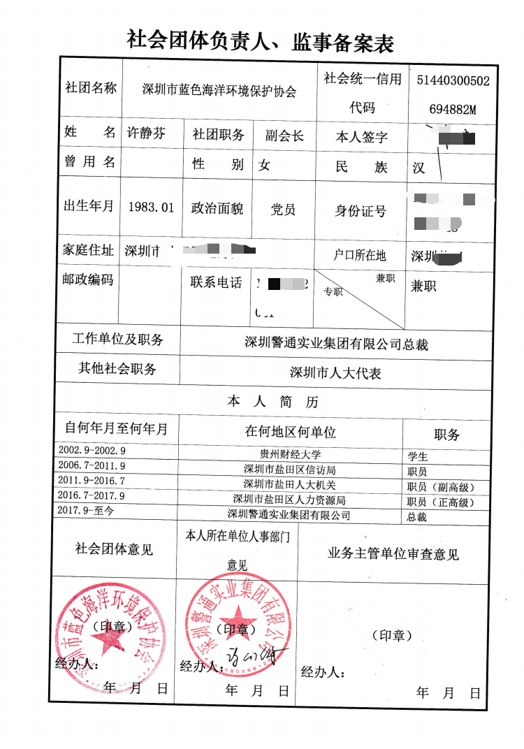 根据《深圳市蓝色海洋环境保护协会社会团体章程》及选举相关规定,经推荐/提名/资格审查,现将第五届理事会监事会主要负责人资料公示如下: